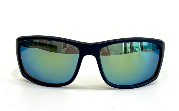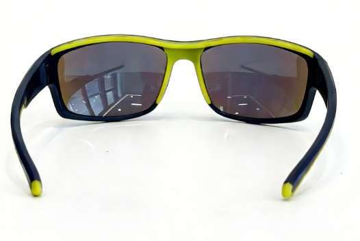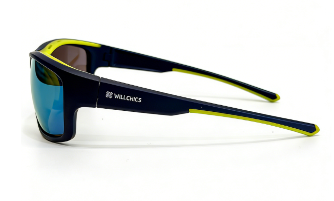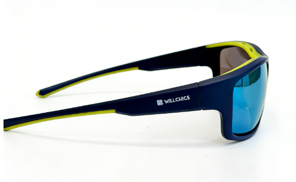 Frame: mat dark blue frame+yellow rubber shield+yellow rubber embedded temple+yellow rubber nosepad